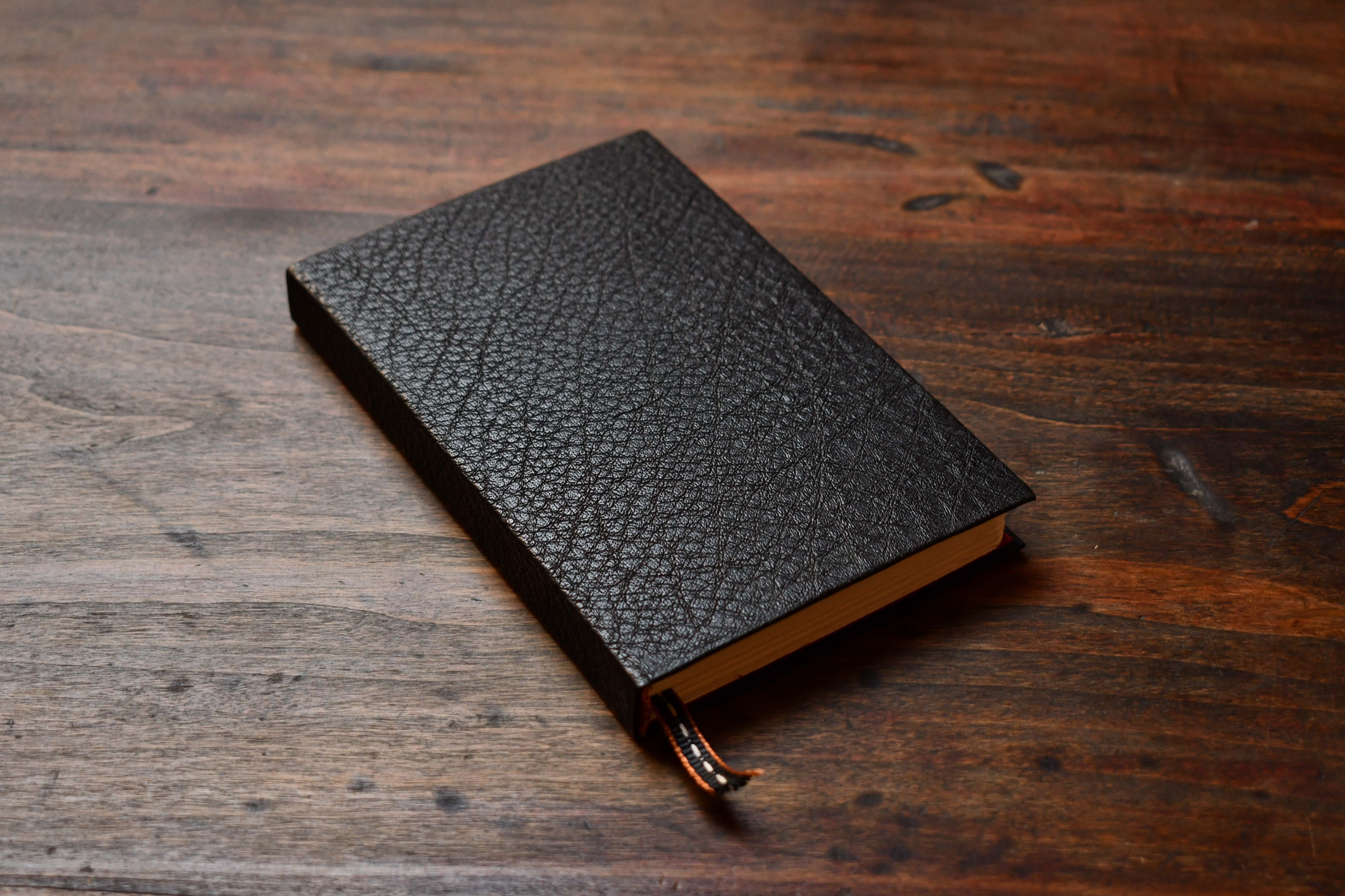 Reliure souple format A6. Dos plat. Couvrure plein cuir de buffle noir, gardes couleur en papier uni. Tranchefiles mécaniques et signet.