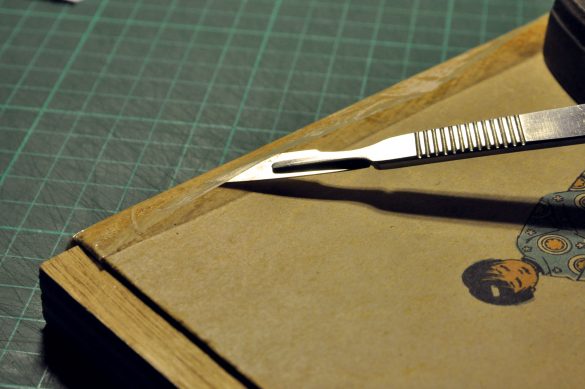 Dépose d’un adhésif posé à cheval entre dos et plat avant. Restauration des fonds de cahiers, du dos et des couvertures. Remboitage de l’ouvrage dans sa jaquette d’origine.